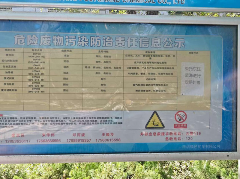 我濰坊碩邑化學(xué)有限公司現(xiàn)有危險廢物八種,分別為廢活性炭(HW49 900-039-49)、乳化劑等助劑包裝物(HW49 900-041-49)、油漆桶(HW49 900-041-49)、廢試劑瓶(HW49 900-041-49)、化驗室廢液(HW49 900-047-49)、廢機(jī)油桶(HW08 900-249-08)、廢機(jī)油(HW08 900-214-08)、廢過濾吸附物(HW49 900-041-49)。